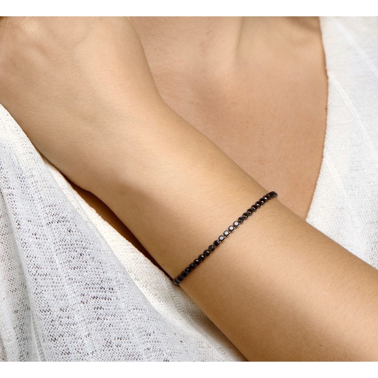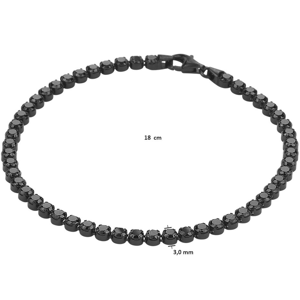 Zwart ruthenium 925 zilveren tennisarmband uitgevoerd met zwart zirkonia en een stevige karabijn sluiting. De armband heeft een draaglengte van 18cm en een breedte van 3mm. KA1200002