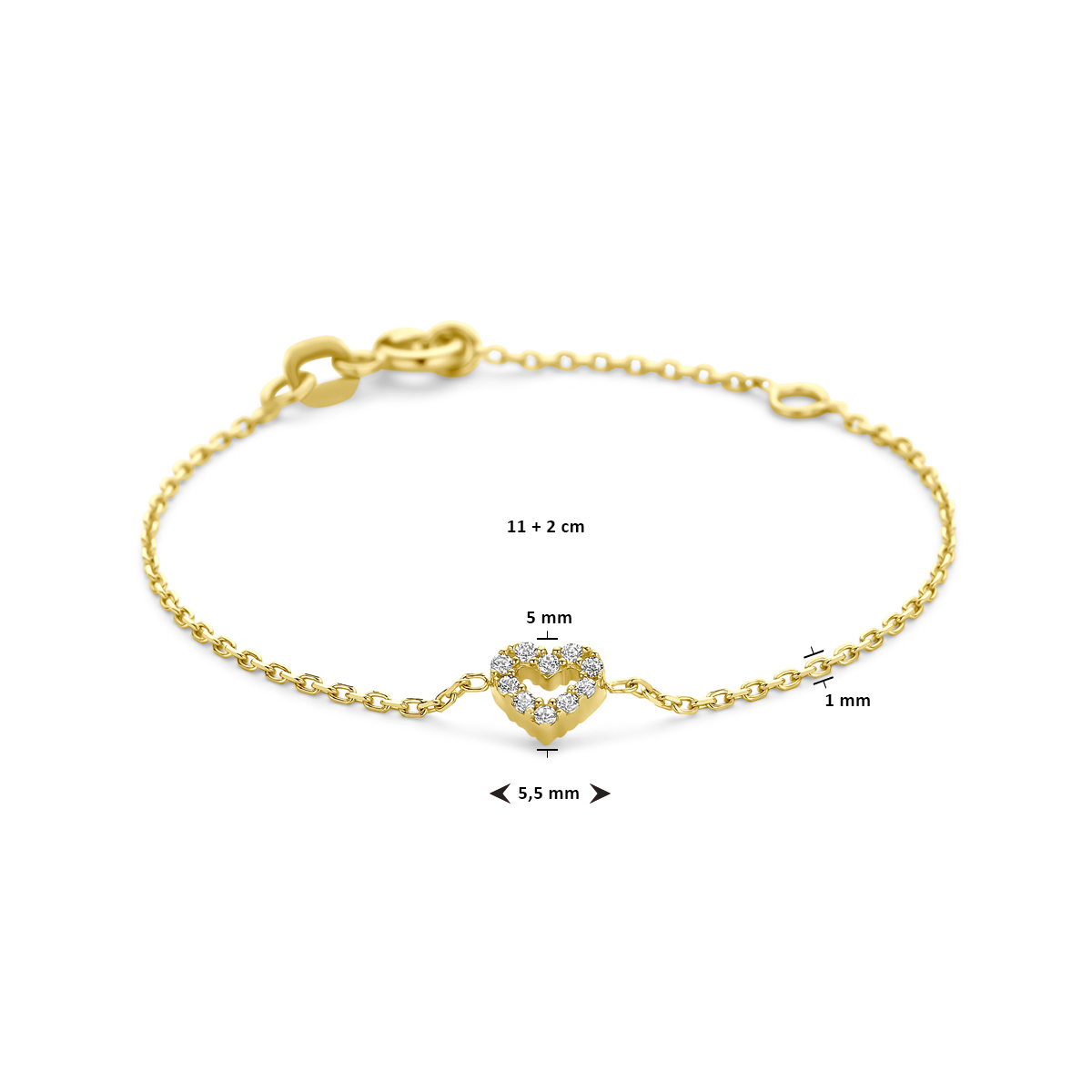 14k Geelgouden armband uitgevoerd met een hart en zirkonia. De armband heeft een draaglengte van 11cm en een extensie van 2cm.