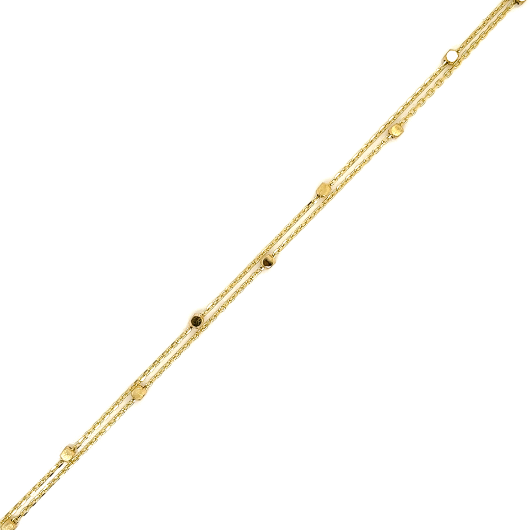 Deze 14-karaats geel gouden armband heeft een speelse uitstraling, dit komt door de dubbele armband. De ankerschakel wordt onderbroken door gouden blokjes. Deze armband is perfect voor iemand die houdt van geelgoud!