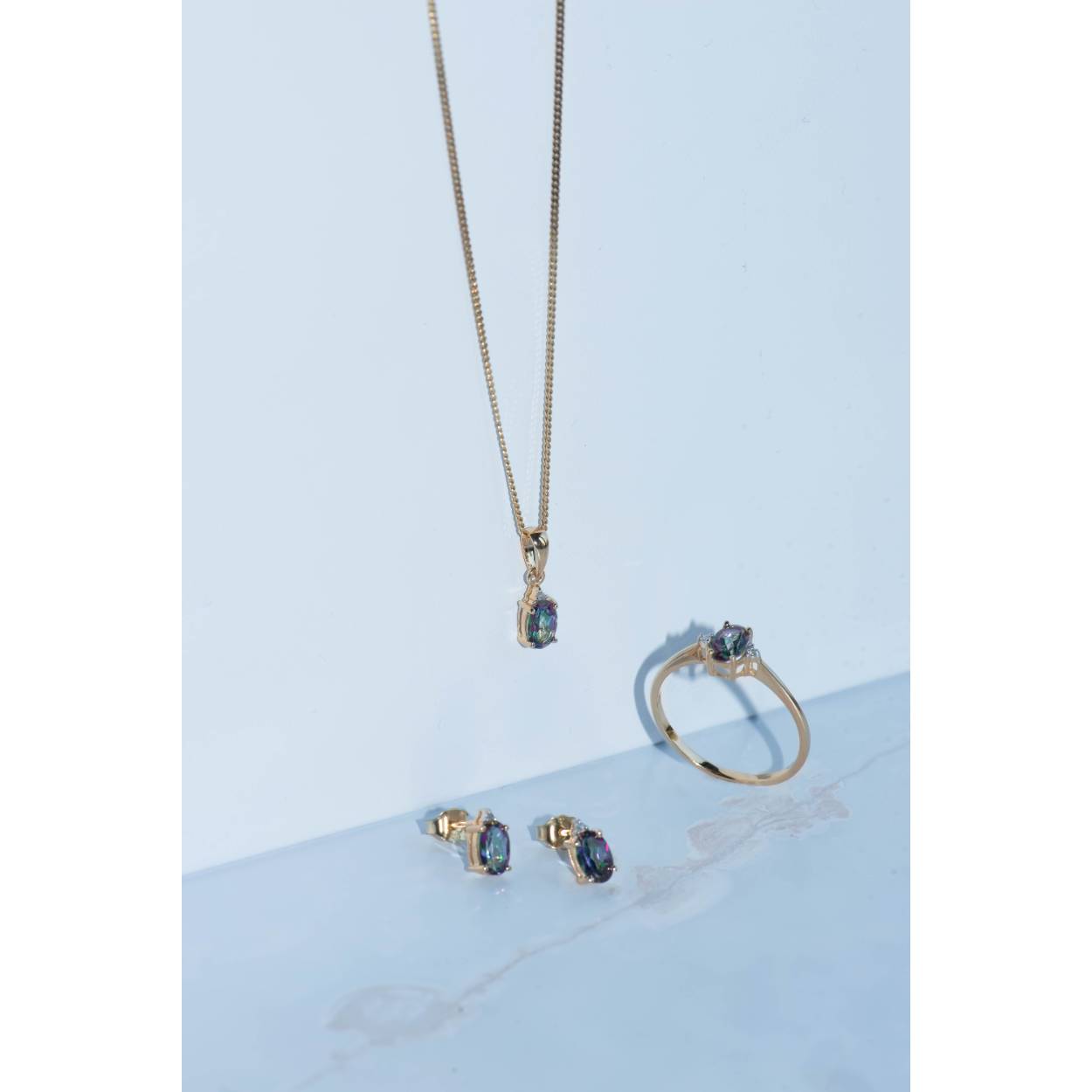 Deze geel gouden hanger bevat een schitterende Mystic Green Topaas. De kleursteen is gezet tussen vier gouden zetpoten met daarboven een klein diamantje. Een prachtige subtiele hanger voor een kleurrijke gelegenheid.