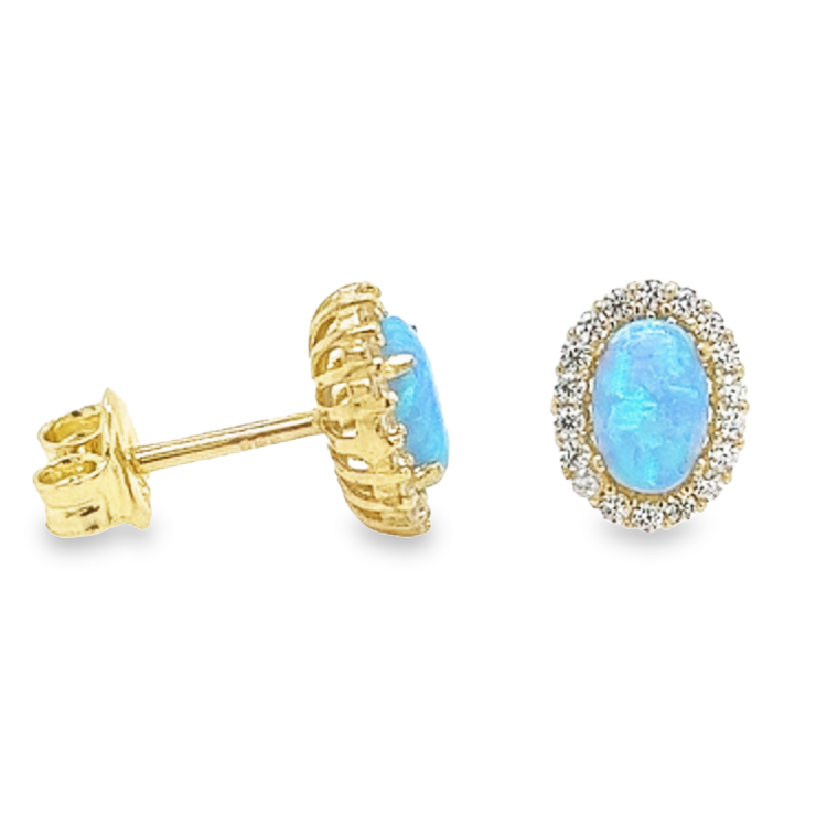 Deze oorstekers zijn ontzettend elegant. De ovaal geslepen steen is een blauw gekleurde opaliet geklemd tussen vier zetpoten. De kleine steentjes zijn briljant geslepen zirkonia's.