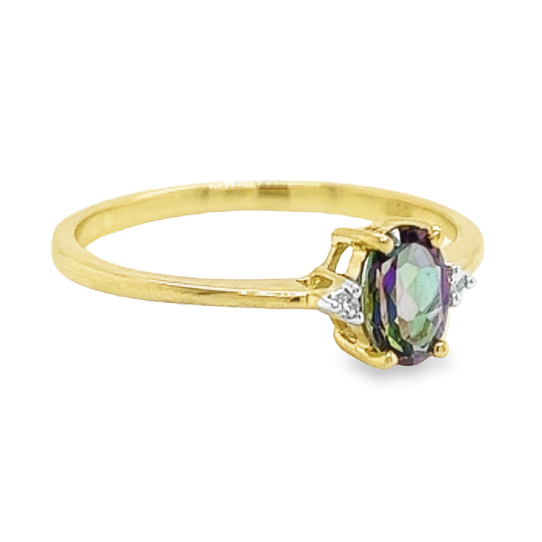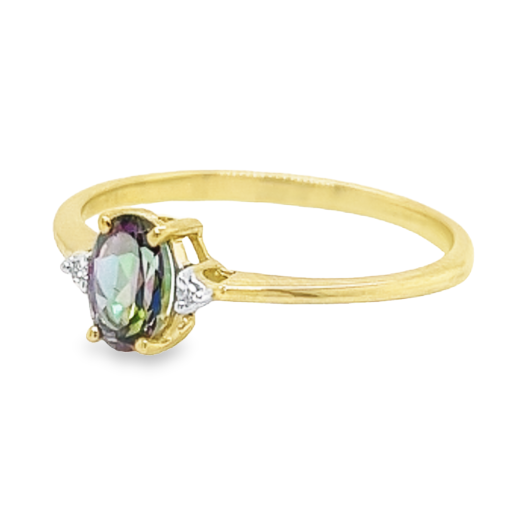 Deze 14-karaats geel gouden ring is ontzettend leuk. De kleurrijke steen is een echte Mystic green Topaas welke is gezet tussen vier gouden zetpoten. Naast de kleursteen zijn twee diamantjes gezet. Deze ring heeft een schitterende en kleurrijke uitstraling.