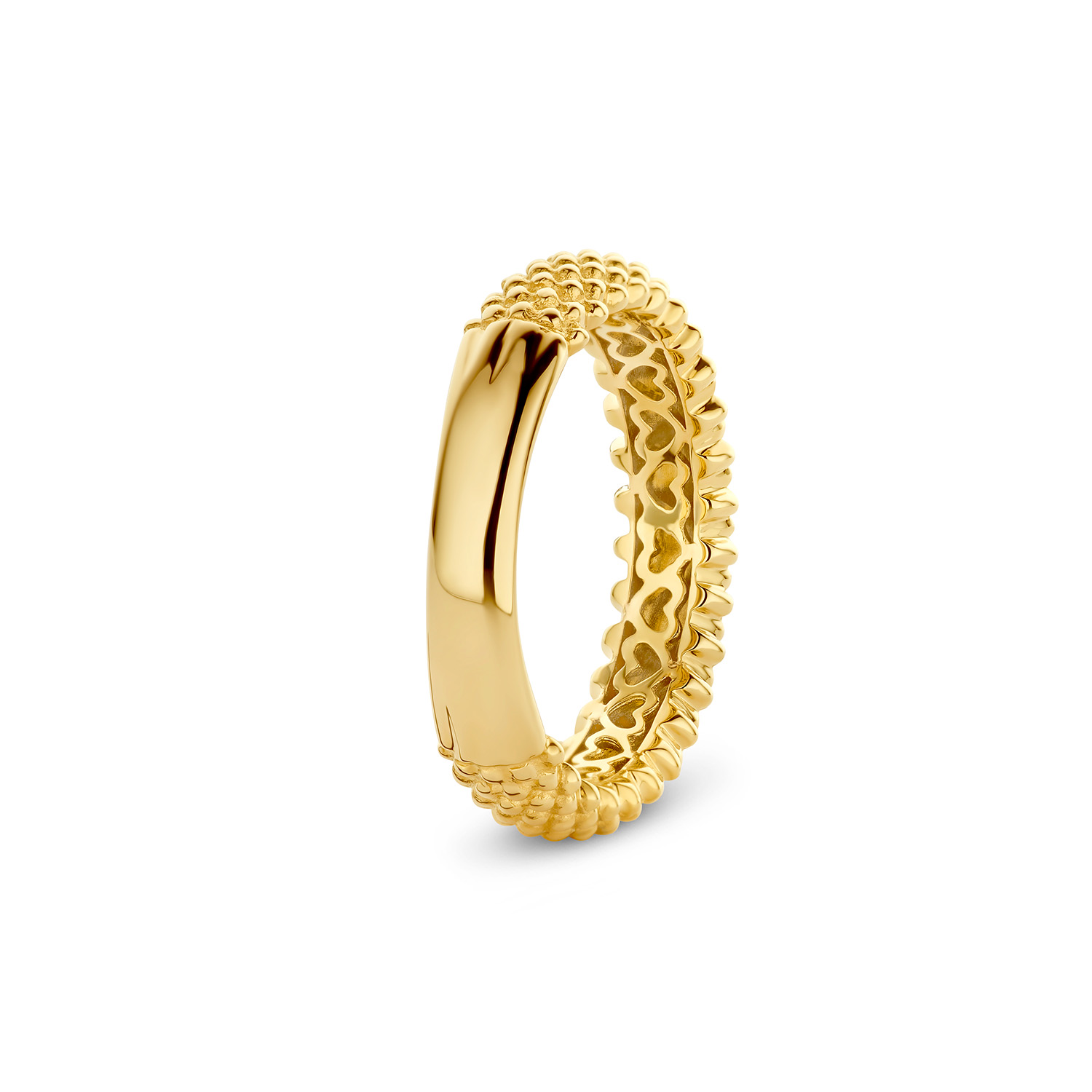 Deze 14 karaat geelgouden ring van Glow is erg uniek door het mooie motief. De ring heeft een breedte van 5mm en is verkrijgbaar in de maten 52, 54, 56 en 58. De binnenkant van de ring bestaat uit Secret Hearts. Hierdoor heeft de ring een hoog draagcomfort.