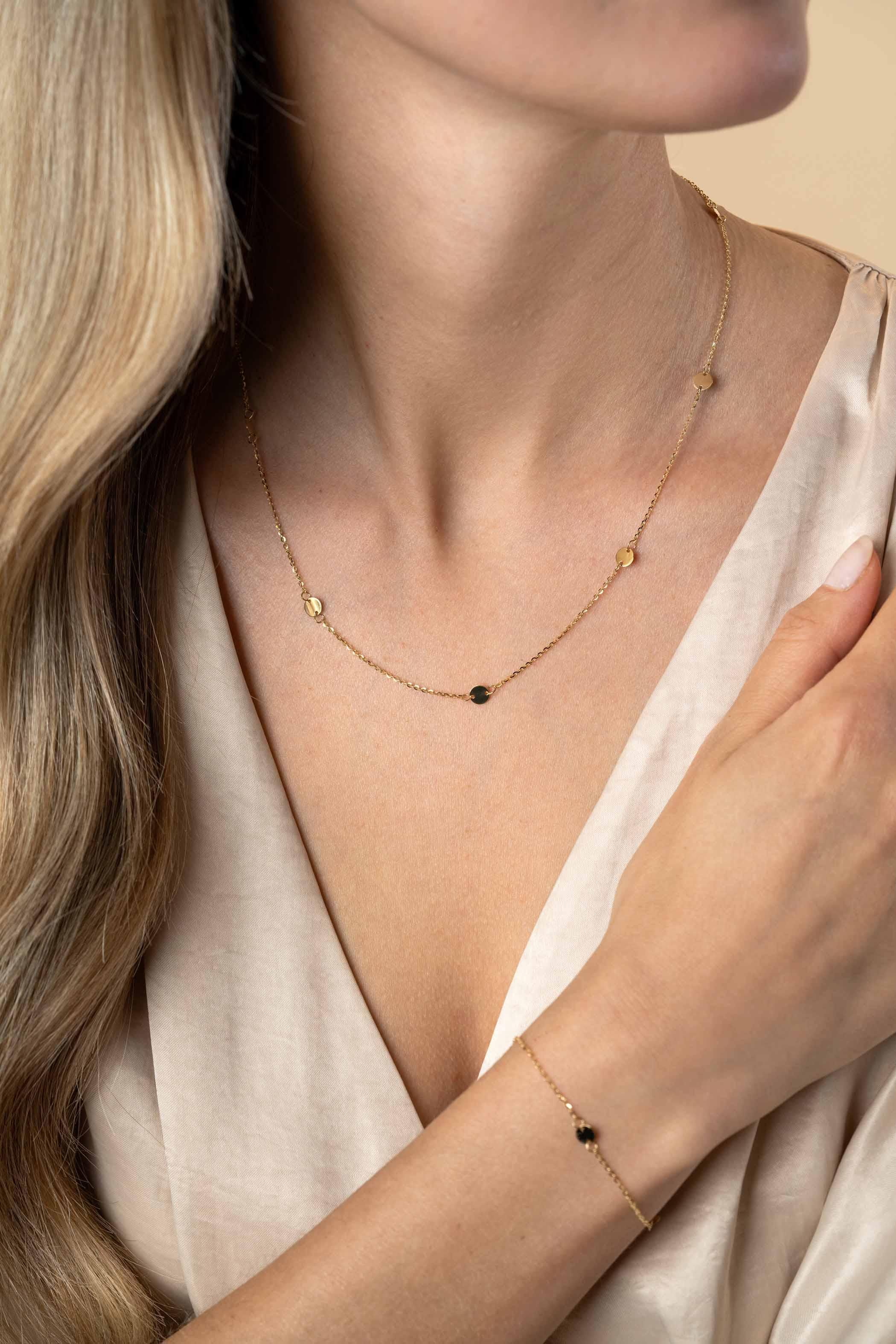 ZINZI Gold 14 krt gouden ketting met subtiele jasseron schakels en zeven ronde gladde plaatjes 5mm breed 42-45cm ZGC444